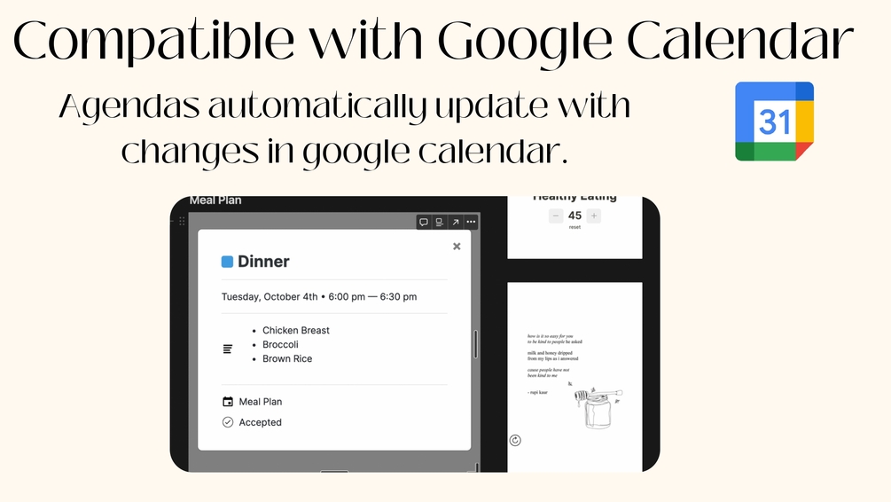 This template is compatible with Google Calendar! Once linked, the agenda/meal plan calendars will automatically sync every time you make a change on Google Calendar.